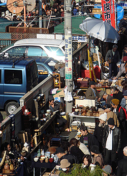 今年も年末の世田谷ボロ市開催です。前日の雨の為、午前中なら人も込み合わないだろうと目論んで出掛けたのですが、結構込み合っています。名物の「代官餅」はいつも以上に行列が出来ていて尋常じゃありません。なんだか年々パワーが出なくなっている私達。当然モチはあきらめて次の目的に。今回は田中さんが珍しくテンションが高く、どうやらアンティーク家具でビデオ収納を作りたいらしいのです。ところがいつもの家具屋さんは出店してないわ、他の店にもめぼしいモノは無いわで一気にテンションが下がって行きます。「もう事務所帰って昼飯にしよう・・・」 |