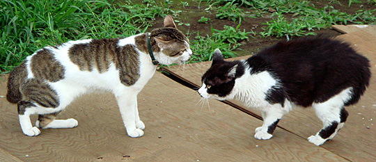 現場近くの空き地で飼い猫と野良猫の戦いが始まるらしい。白黒の野良猫はしっぽを丸めて声も出さず、マンガみたいに毛を起てて静止!方や白地に虎柄の飼い猫はしっぽをくねくね揺らしながら、のっそのっそ「ナァ~オ!ナァアァ~オ!!」うめきながら威圧的に野良猫に接近。「ウワァ~戦いが始まるぞぉ~」っと思いつつデジカメ構えて急接近!! |