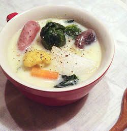 毎度おなじみのお客様にいただいた芽キャベツとオレンジブーケという黄色いカリフラワー。そして人参、カブ、ターサイ。ソーセージはお歳暮・・と、頂き物ばかりで作ったさっぱりシチュー。 12月に入って冬らしい日がつづく今日この頃、あったかシチューは体が暖まるねぇ~~。 |