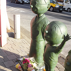 「サザエさん」の波平さんの声優、永井一郎さんの訃報をきいて、近所の桜新町駅の銅像には花束が手向けられていました。私はよく知らないんだけど、田中さん曰く永井さんは超有名なすごい声優さんなんだとか。 |